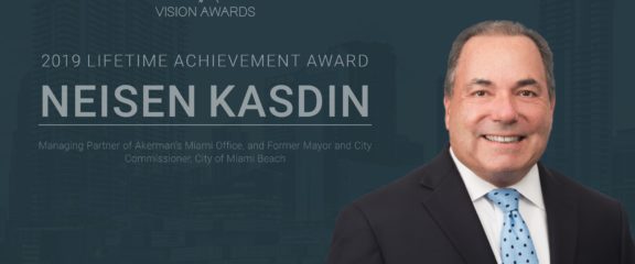 Top Story 2019 Lifetime Achievement Award Recipient: Neisen O. Kasdin - Managing Partner, Akerman's Miami Office March 21, 2019 Former Miami Beach Mayor, longtime leader named ULI's 2019 Lifetime Achievement Award Honoree Announcement Awards Awards & Competitions